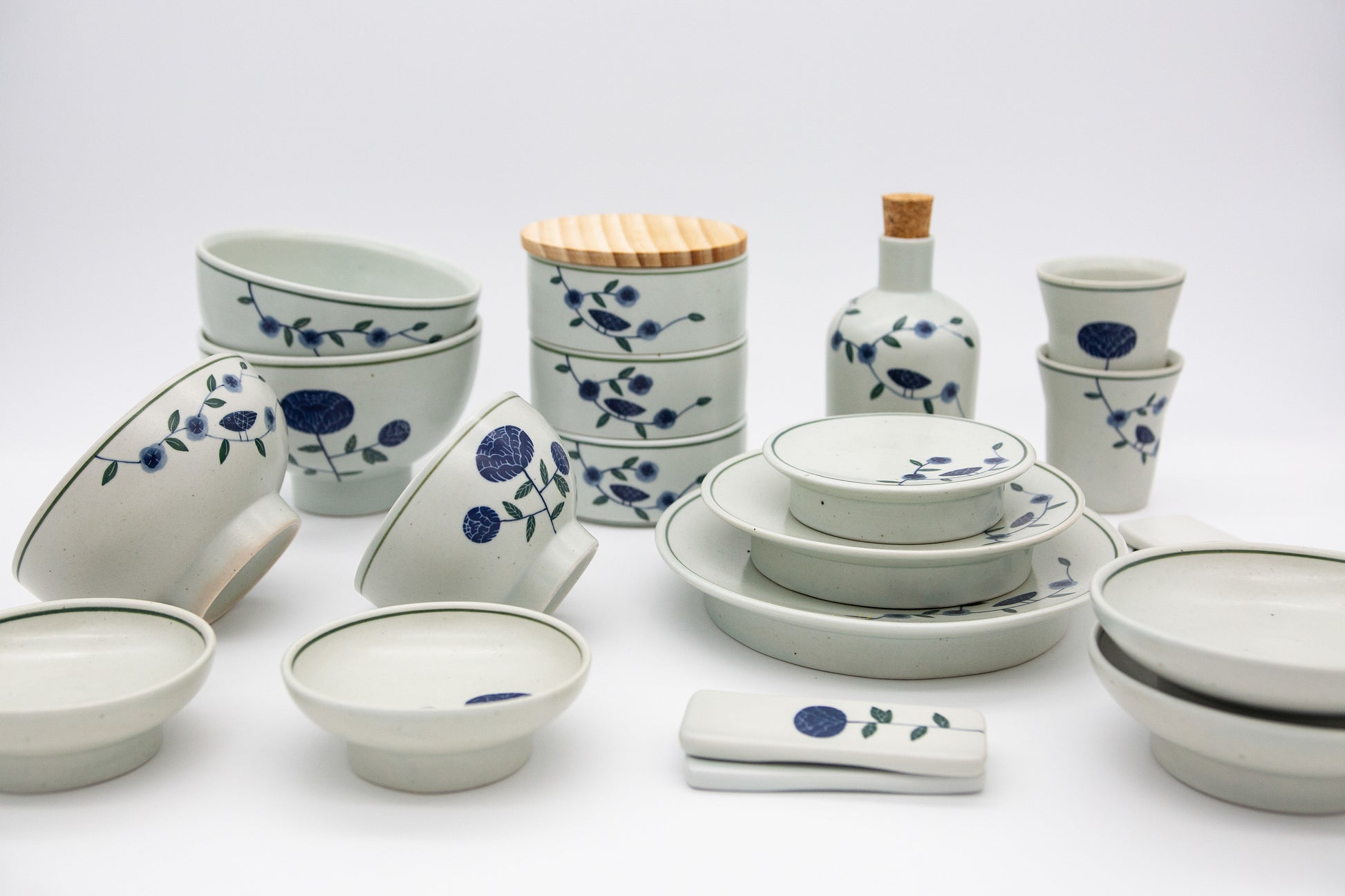 The artist wanted to give the feeling of old white porcelain by mixing San-Cheong Clay(산청토). This was to give the natural warmth of the soil as iron is scattered. After that, it is completed by drawing the artist's signature blue folk painting on the surface. Above all, artists pursue beautiful works when they contain food.