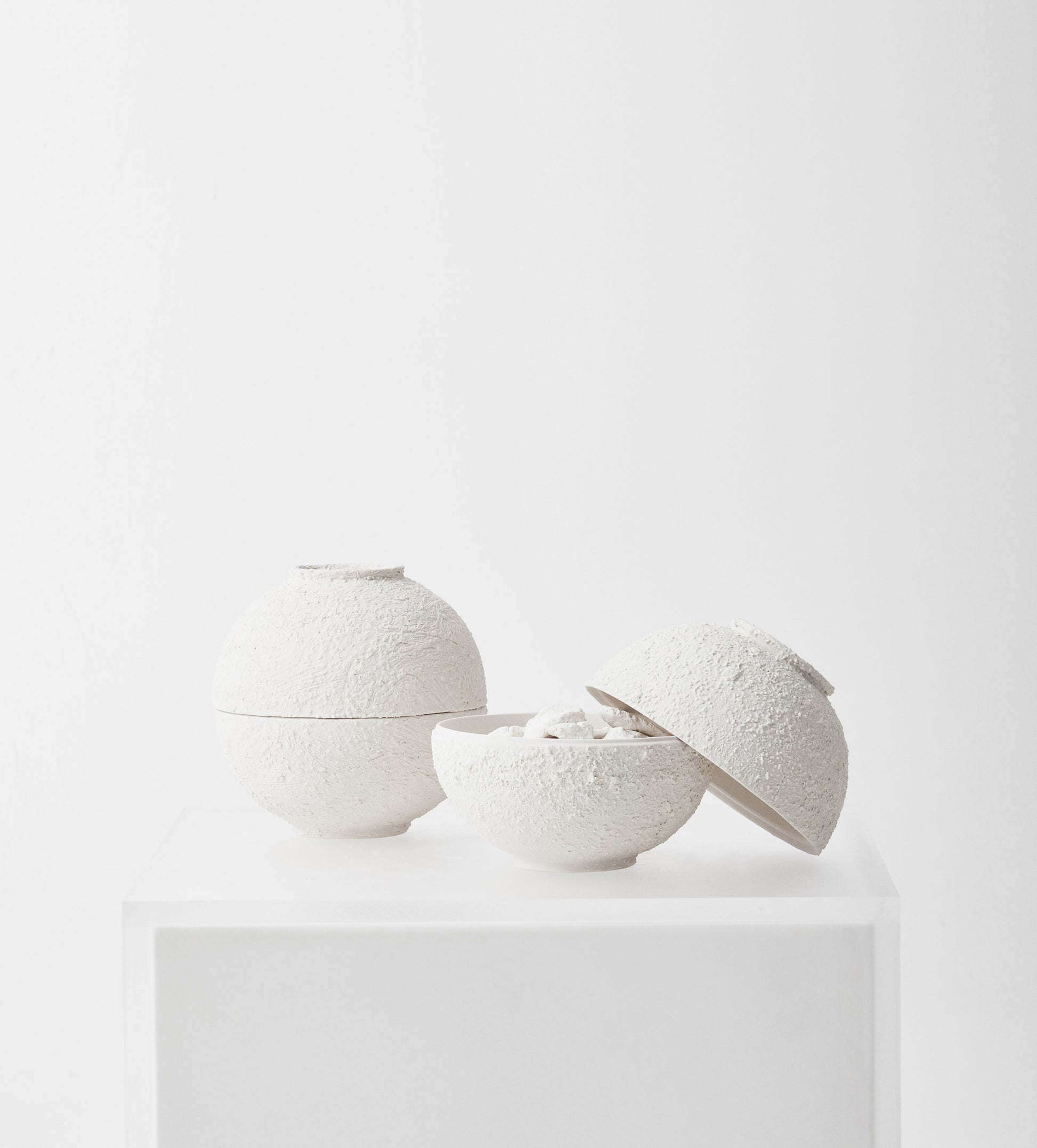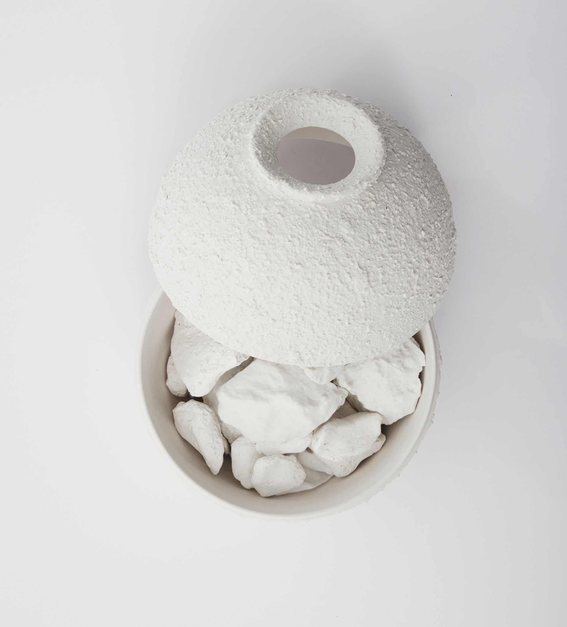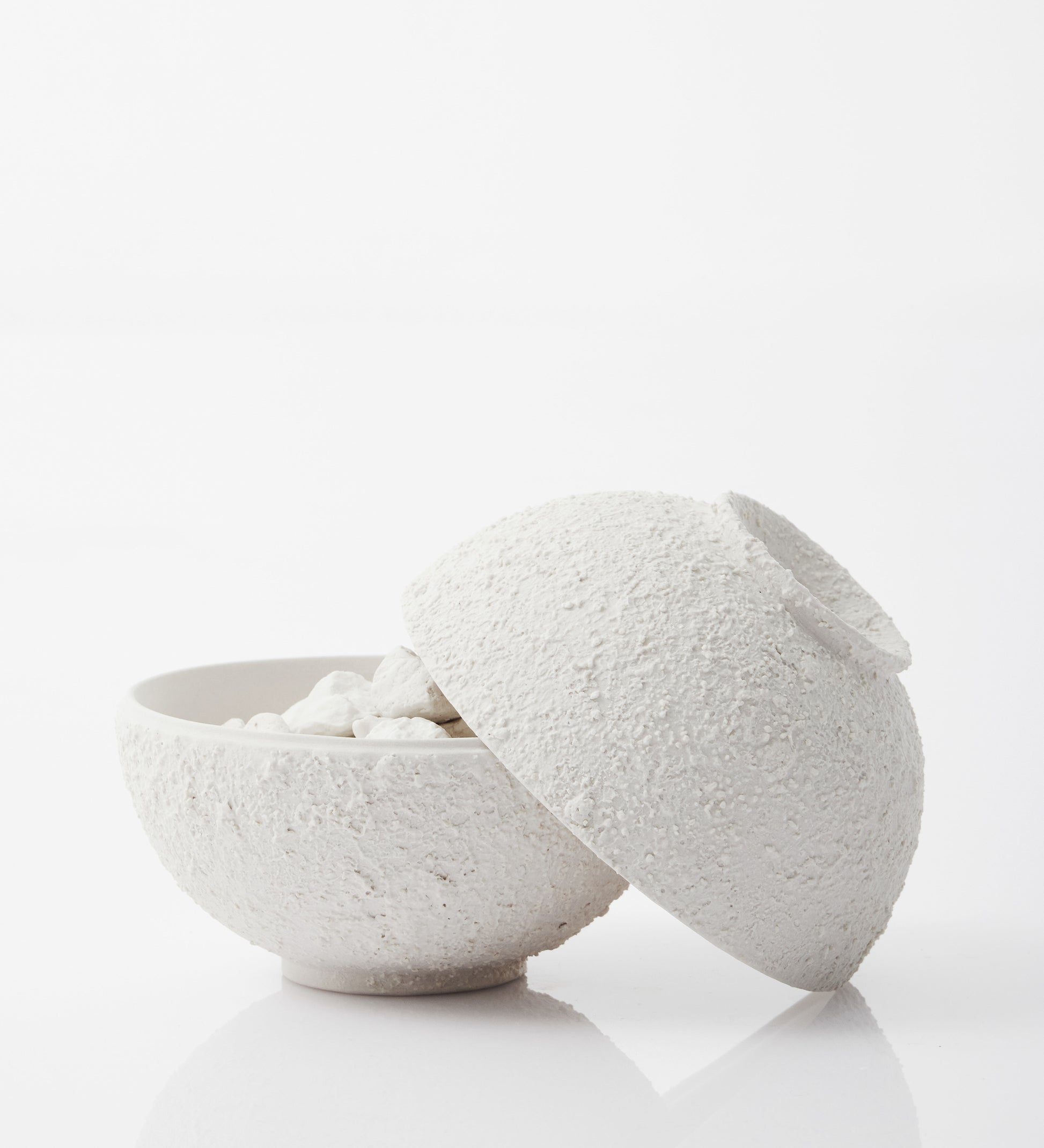 Inspired by the traditional Korean moon jar, this dry diffuser is a harmonious blend of heritage and contemporary design. The imperfect moon jar has long been a symbol of simplicity and balance in Korean ceramics. In this piece, the artist sought to translate that timeless aesthetic into a contemporary context by applying a unique white texture that emphasizes both the purity of form and the tactile feel of the piece.